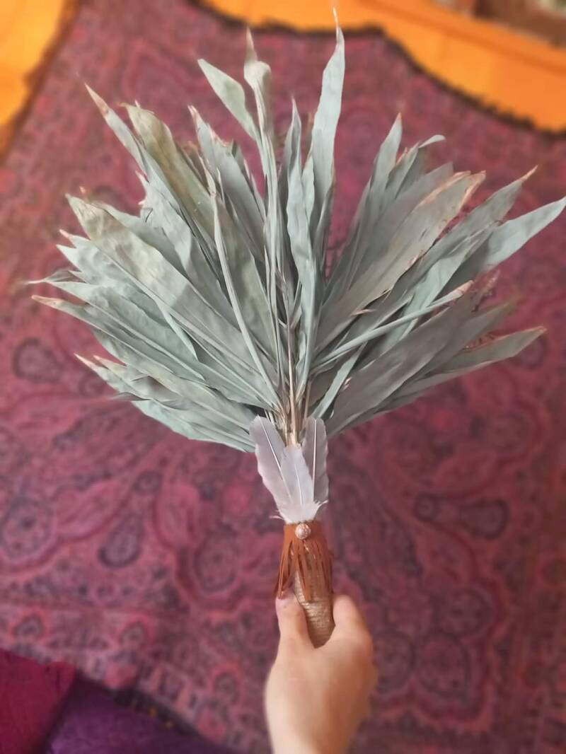 Daarna worden mijn bladeren schoongemaakt, gesorteerd en gedroogd en dan word ik samen gebonden als een helend instrument.